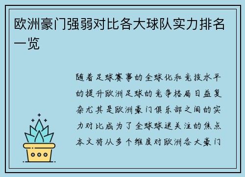 随着足球赛事的全球化和竞技水平的提升,欧洲足球的竞争格局日益复杂。尤其是欧洲豪门俱乐部之间的实力对比,成为了全球球迷关注的焦点。本文将从多个维度对欧洲各大豪门足球俱乐部的强弱进行详细分析,并对当前各支球队的实力进行排名。文章将涵盖球队的历史成就、阵容深度、战术体系和近年表现等方面,力求通过全面的视角揭示当前欧洲足球强队之间的对比和排名情况。通过对这些方面的分析,文章旨在帮助读者全面了解欧洲足球豪门的实力差距及其未来发展趋势。