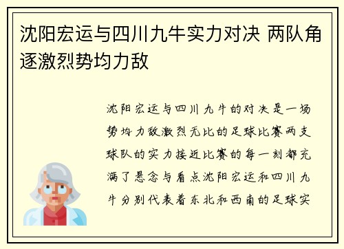 沈阳宏运与四川九牛的对决,是一场势均力敌、激烈无比的足球比赛。两支球队的实力接近,比赛的每一刻都充满了悬念与看点。沈阳宏运和四川九牛分别代表着东北和西南的足球实力,它们在联赛中的表现都不容忽视。这场比赛不仅是双方球迷热切期待的盛事,也成为了检验两队战术、团队协作和个人能力的关键战役。整场比赛中,双方通过精准的进攻布局、坚韧的防守策略以及场上球员的表现,展现了彼此的强劲实力。在赛场上,无论是战术博弈,还是球员之间的对抗,都充分体现了比赛的激烈性。本篇文章将从战术分析、球员表现、历史对战和球迷影响四个方面,详细分析沈阳宏运与四川九牛的这场实力对决,深入探讨两队势均力敌的原因。