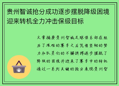 文章摘要:贵州智诚足球俱乐部在经历了艰难的赛季之后,凭借坚韧的努力和队员们的不懈拼搏,逐步摆脱了降级的困境,并迎来了赛季中的转机。通过一系列关键的抢分表现,贵州智诚成功地调整了战术策略,增强了球队凝聚力,逐步向保级目标迈进。面对越来越激烈的保级竞争,球队在教练的引导下,通过阵容优化、战术改进和心理建设,最终力图实现保级目标。本篇文章将从多个角度详细分析贵州智诚如何通过不同的战略调整和积极的赛场表现,成功摆脱降级危险,全力冲击保级目标。