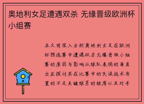 本文将深入分析奥地利女足在欧洲杯预选赛中遭遇双杀,无缘晋级小组赛的原因与影响。从球队表现的角度出发,探讨其在比赛中的失误、战术布置的不足、关键球员的缺席以及对手的强大等因素,详细分析这场失利对于球队未来的影响。奥地利女足作为欧洲足球强国之一,在女子足球领域的地位不容小觑,但在本届欧洲杯预选赛中,他们却未能挺进小组赛。通过回顾比赛的关键节点与教训,本文为大家呈现一场令人痛心的失利背后的深层次原因。