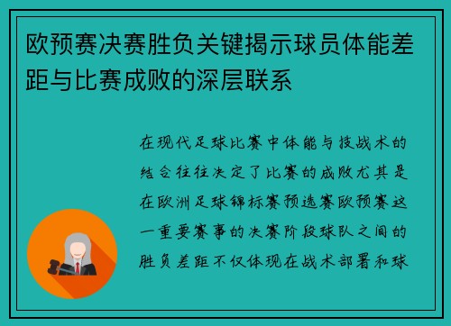 体能差距在比赛的关键时刻,尤其是比赛的最后阶段,常常成为决定胜负的关键因素。在欧预赛决赛中,比赛通常会进入加时赛或点球大战,而这时球员的体能储备往往直接影响其表现。在比赛的最后时刻,体能差距明显的球队往往处于劣势。