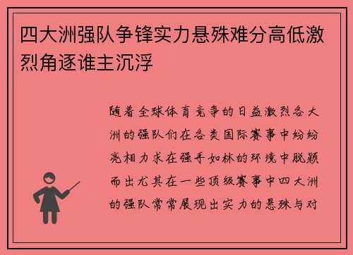 随着全球体育竞争的日益激烈,各大洲的强队们在各类国际赛事中纷纷亮相,力求在强手如林的环境中脱颖而出。尤其在一些顶级赛事中,四大洲的强队常常展现出实力的悬殊与对抗的激烈,使得赛事的每一次较量都成为球迷和媒体关注的焦点。在这篇文章中,我们将详细探讨四大洲强队之间的实力对比,剖析它们在各自领域内的优势与劣势,深入探讨谁能在这场激烈角逐中主宰沉浮。我们从球队实力、球员表现、战术策略、历史积淀四个方面进行分析,力图全面呈现这些顶级强队间的差距与博弈,最终看谁能在全球竞技舞台上主宰未来。