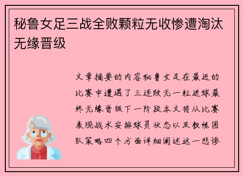 秘鲁女足在最近的比赛中遭遇了三连败,无一粒进球,最终无缘晋级下一阶段。本文将从比赛表现、战术安排、球员状态以及教练团队策略四个方面详细阐述这一悲惨的淘汰经历,探讨背后的原因与教训。